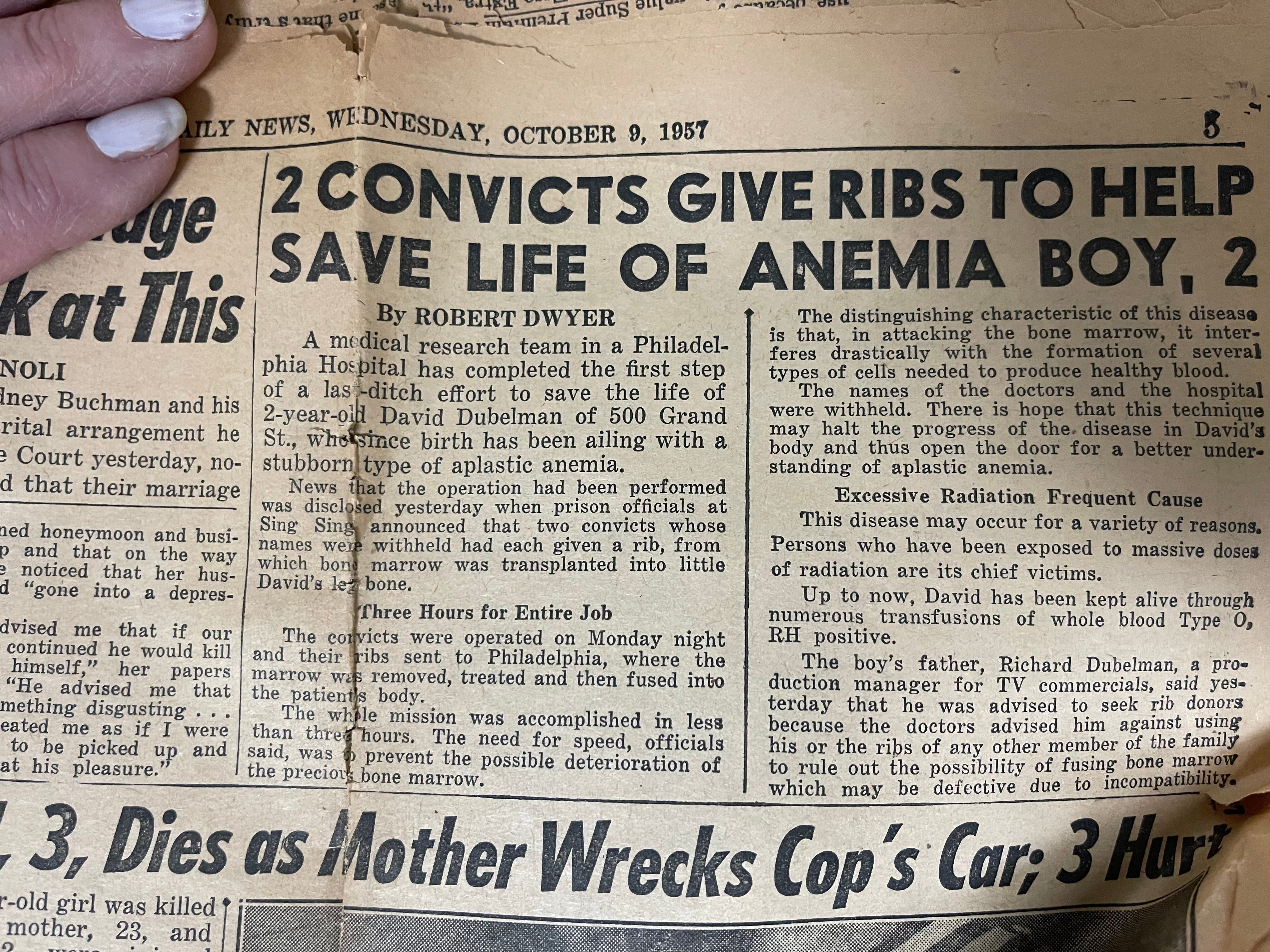 The newspaper clipping reads like a mix of heroism, sci-fi, and bureaucratic courage. “2 CONVICTS GIVE RIBS TO HELP SAVE LIFE OF ANEMIA BOY, 2,” the headline screams in bold, mid-century optimism—back when newspapers still believed in miracles, and punctuation was used sparingly and with purpose.